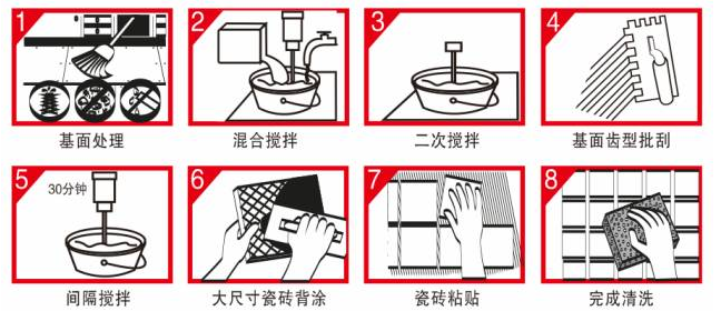 瓷磚膠應(yīng)隨攪隨用,使用時(shí)間控制在2小時(shí)內(nèi),干固后應(yīng)丟棄。