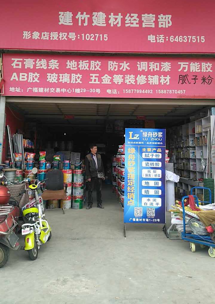 建竹建材經(jīng)營(yíng)部位于廣福建材交易中心1幢29-30號(hào),主要經(jīng)營(yíng)綠舟砂漿生產(chǎn)的以下產(chǎn)品:膩?zhàn)臃邸?a href="http://www.clwvvv.com/czjxl.html" target="_blank" title="瓷磚膠-綠舟砂漿">瓷磚膠、抗裂砂漿、抹灰砂漿、砌筑砂漿、地固、墻固和水泥自流平等產(chǎn)品。是綠舟砂漿多年的合作伙伴,相互信賴。
