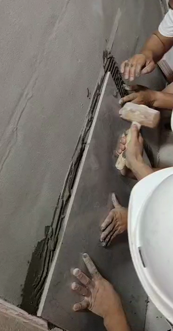 (1)工藝先進(jìn)。瓷磚膠具有良好的保水能力,施工時(shí)間,瓷磚和基底都不必預(yù)先浸泡或者潤濕。如果使用足夠的添加劑并且配比正確,在未固結(jié)的瓷磚膠上的瓷磚也不會(huì)滑動(dòng)。這樣,就不需要再在瓷磚之間插入定位器,并且貼磚也可以自上方向下方進(jìn)行施工,施工的效率及施工質(zhì)量得以大幅提高。