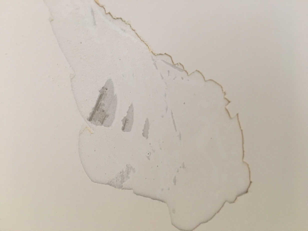 順著脫層處邊緣用小刀翹開(kāi),取一小片脫落層,脫落層處顏色白色,用小刀輕刮,刮開(kāi)后,露出的是黃色墻固層,由此可以看出,脫落是從墻固層里面的基層膩?zhàn)娱_(kāi)始,并不是工長(zhǎng)所說(shuō)的中性墻襯和墻固之間脫落。