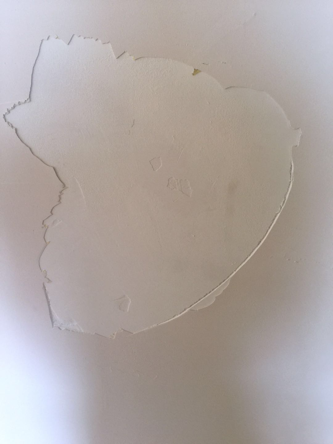 B敲開處面層膩?zhàn)訑嗫谔幤秸瑹o法觀測到什么,但從此處取下小塊膩?zhàn)悠?,用小刀?jīng)削白色的脫落層面,慢慢露出了黃色的面層(乳膠漆層為基本為乳白色),B處也可判斷也是刮了3遍膩?zhàn)尤缓蟠蚰ズ笞龅娜槟z漆。