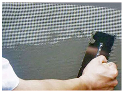 (1)保溫砂漿表面收光時(shí),把耐堿玻纖網(wǎng)布用抹子直接壓在材料表面,同時(shí)收光,嚴(yán)禁漏鋪。