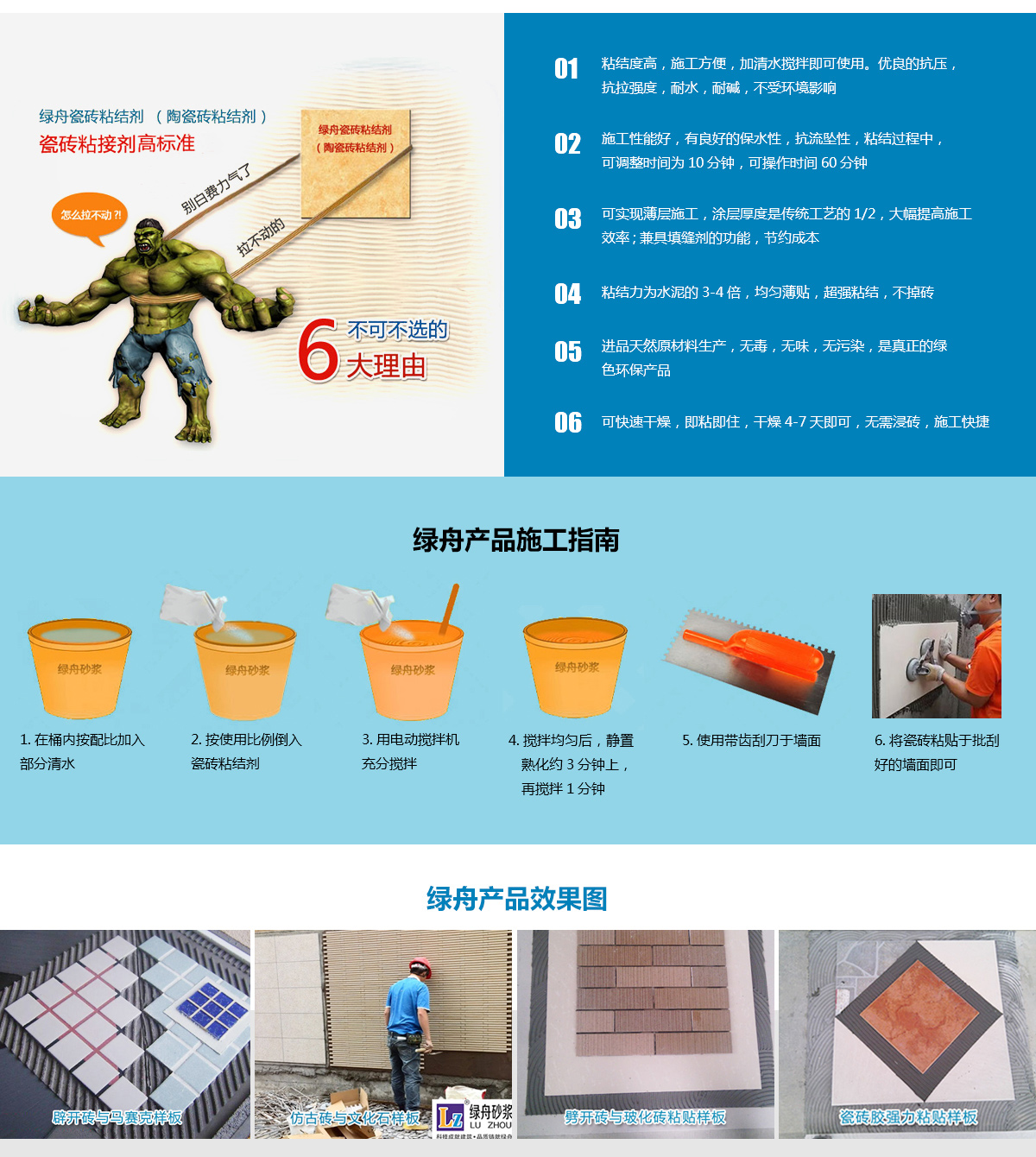 注意事項(xiàng)在電動(dòng)攪拌前,應(yīng)先將水倒放桶內(nèi),再加粉料。攪拌時(shí)間為5--10分鐘,靜置2分鐘后再攪拌一下方可使用。再紙揭離時(shí)間大約在貼磚后30分鐘--2小時(shí),根據(jù)施工環(huán)境及氣候而定;填縫施工時(shí)要填壓密實(shí),海綿擦洗磚面前必須盡可能擰干,否則會(huì)引起填縫強(qiáng)度低和表面泛堿等現(xiàn)象。膠黏劑不宜在0℃以下施工,否則會(huì)出現(xiàn)長時(shí)間不干固的現(xiàn)象。攪拌好的材料,夏天1小時(shí),冬天2小時(shí)內(nèi)用完。切忌將已干結(jié)的膠漿加水混合后再用